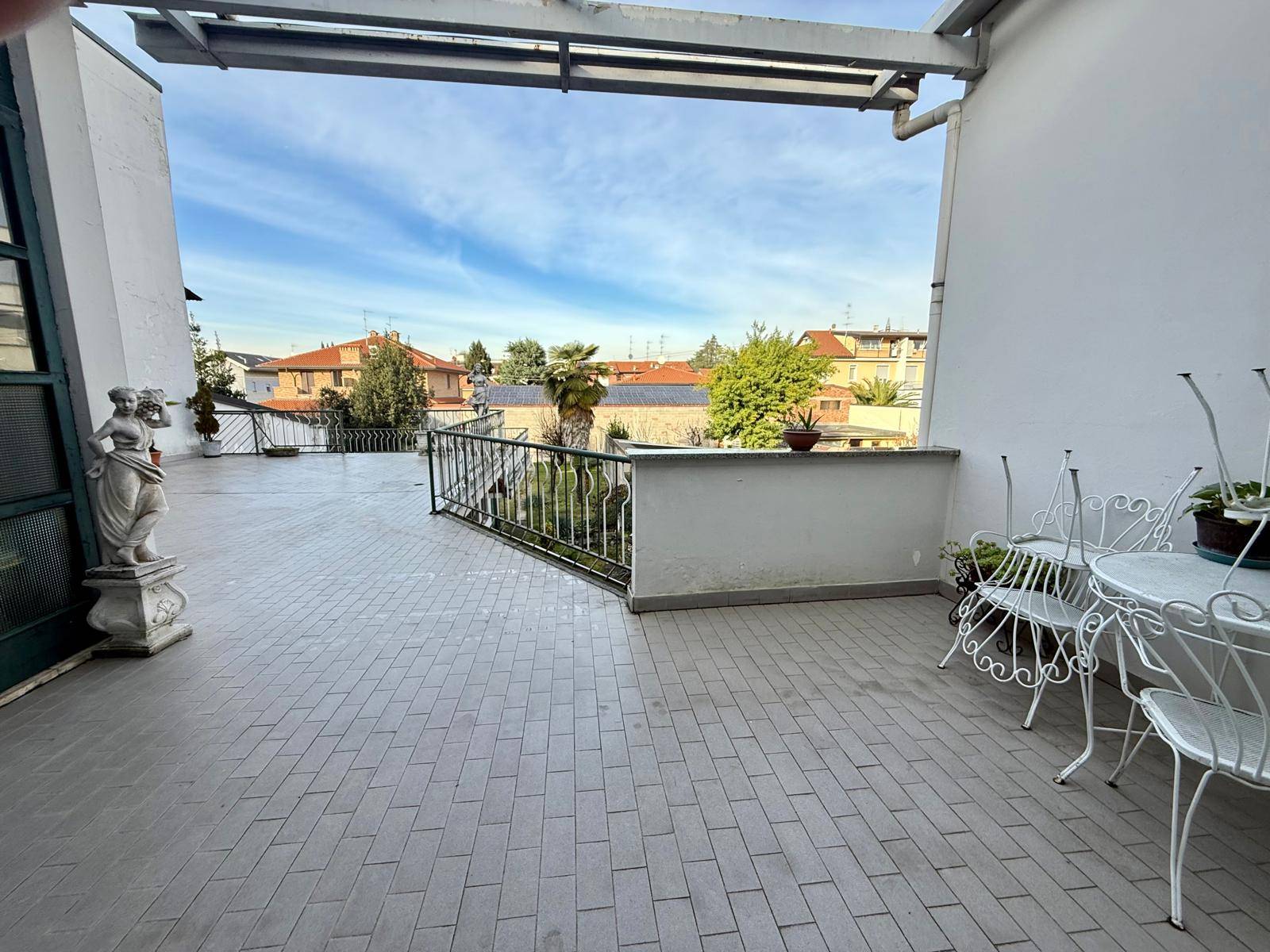 Al primo piano troviamo l'appartamento di 108 mq , a cui si accede da uno spettacolare terrazzo di 100 mq c/a esposto a sud, che lo caratterizza e ne costituisce un valore aggiunto. L'abitazione al suo interno si distingue per gli ambienti spaziosi e ben distribuiti. Una zona d'ingresso conduce al salone servito da un balcone e alla cucina separata, il reparto notte ospita una generosa camera matrimoniale, una cameretta e due bagni finestrati, uno con vasca e l'altro con doccia.